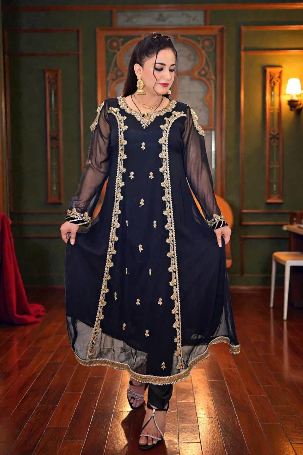Shirt: Crinkle chiffon, bordered with block-printed fabric and exquisitely hand-embellished with mirrors, sequins, and beads.